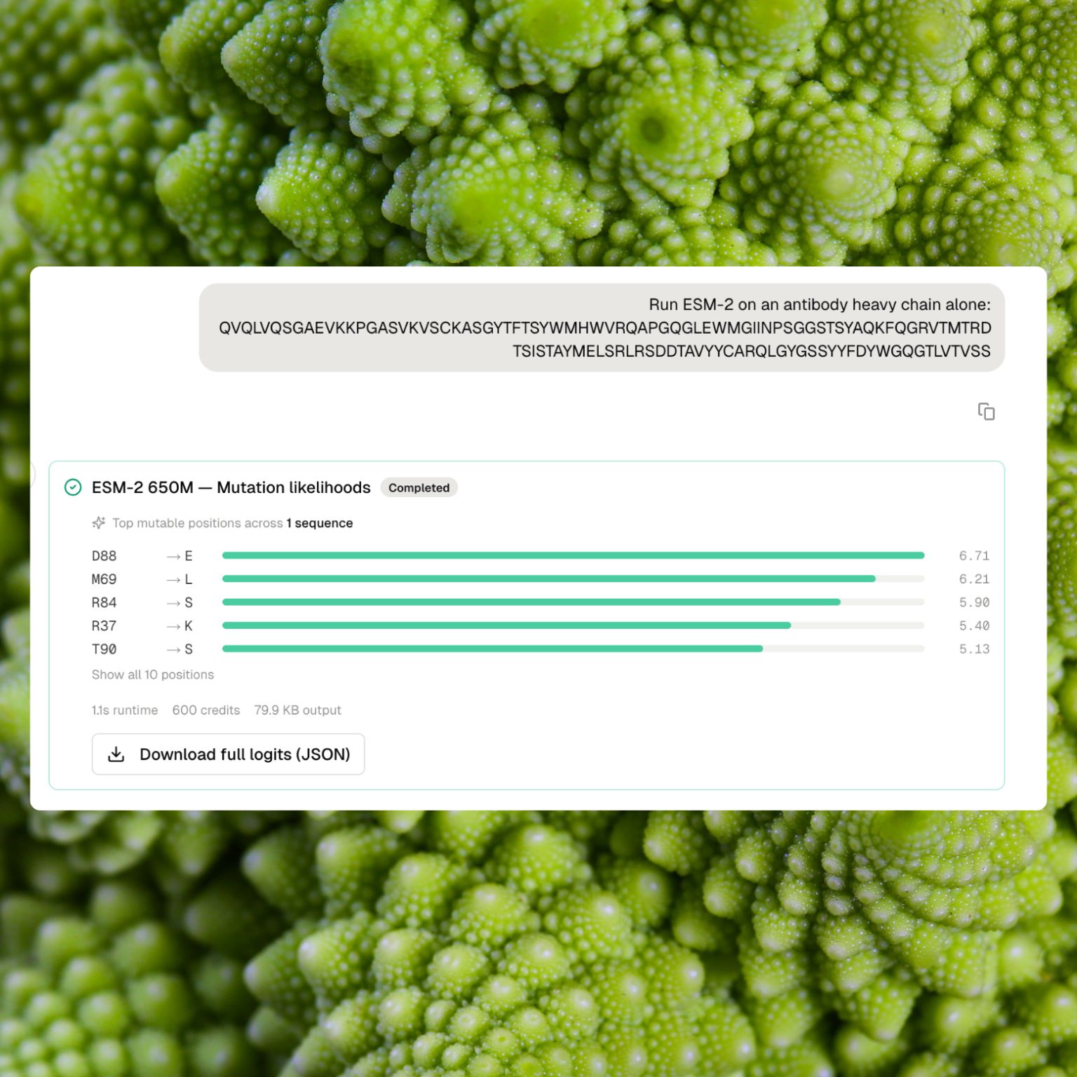 - “Give me per-position mutation likelihoods for this enzyme using ESM-2.”